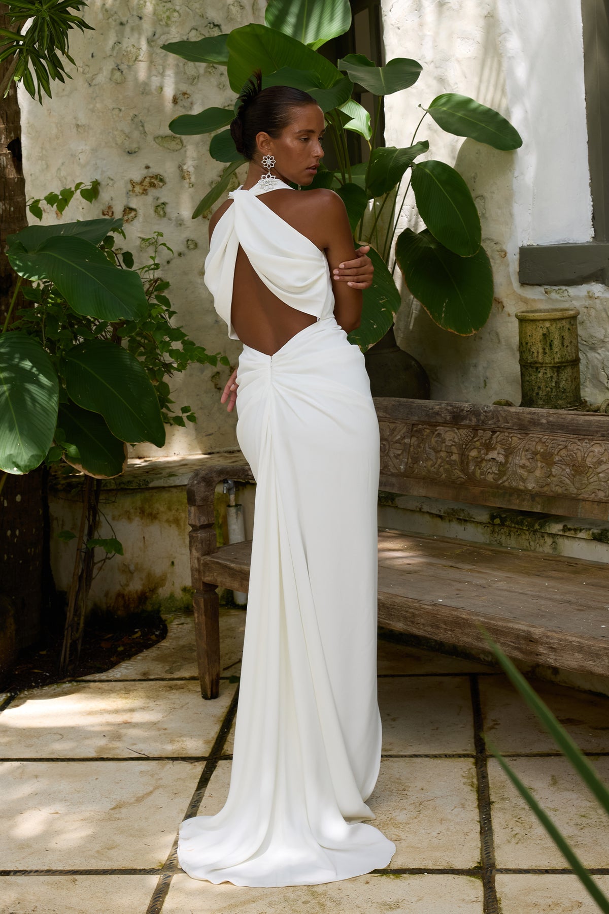 Artemis is a sculptural bridal gown defined by clean lines and elegant draping. The softly contoured bodice highlights the waist, while the fluid skirt falls effortlessly, creating a refined and elongated silhouette. A modern yet timeless design, Artemis is made for the bride who values understated strength and confident femininity.