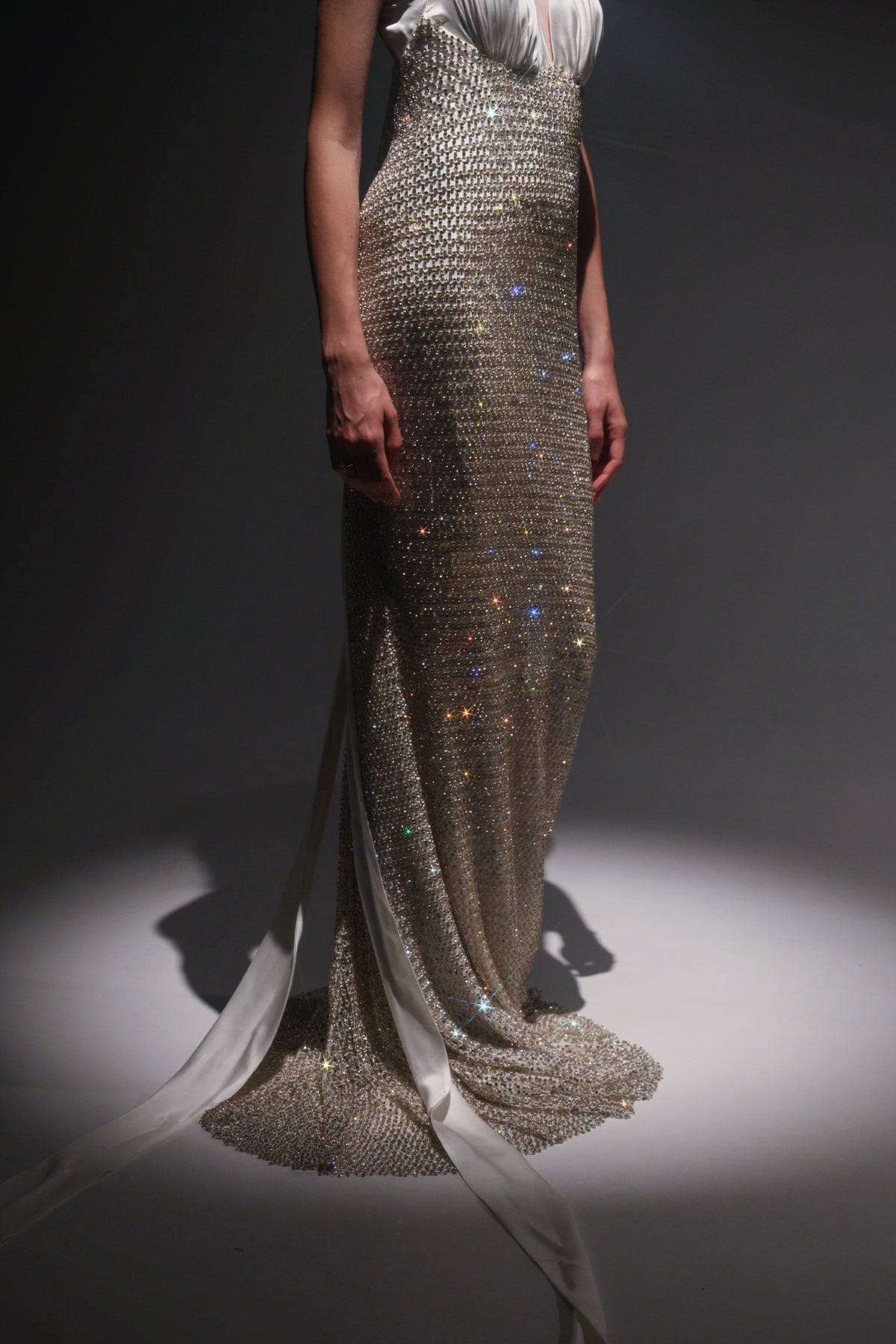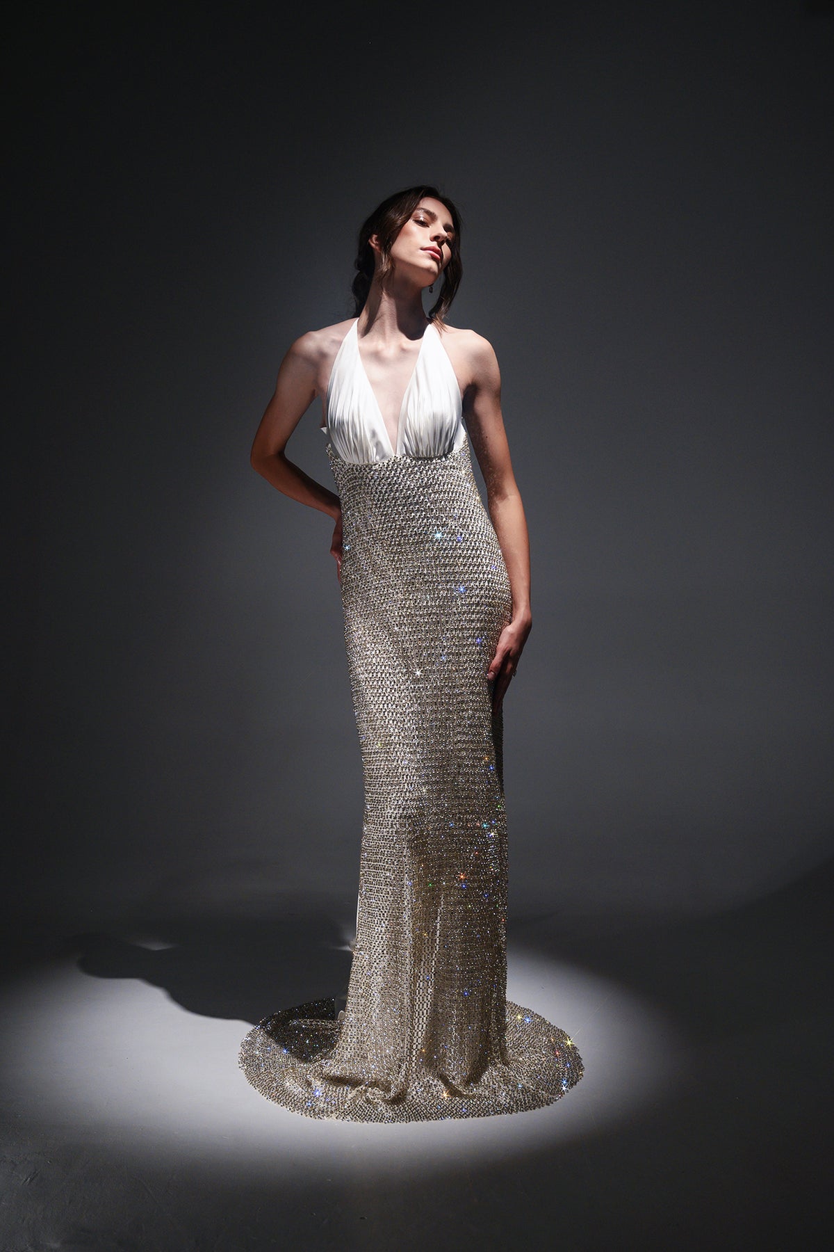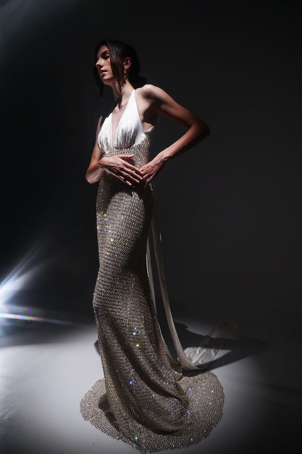 The Orea dress is defined by a deep halter neckline and a fluid, elongated silhouette that follows the body with ease. The softly shimmering skirt adds subtle luminosity, while the clean lines maintain a refined and modern balance. A statement bridal design combining sensuality and understated elegance.