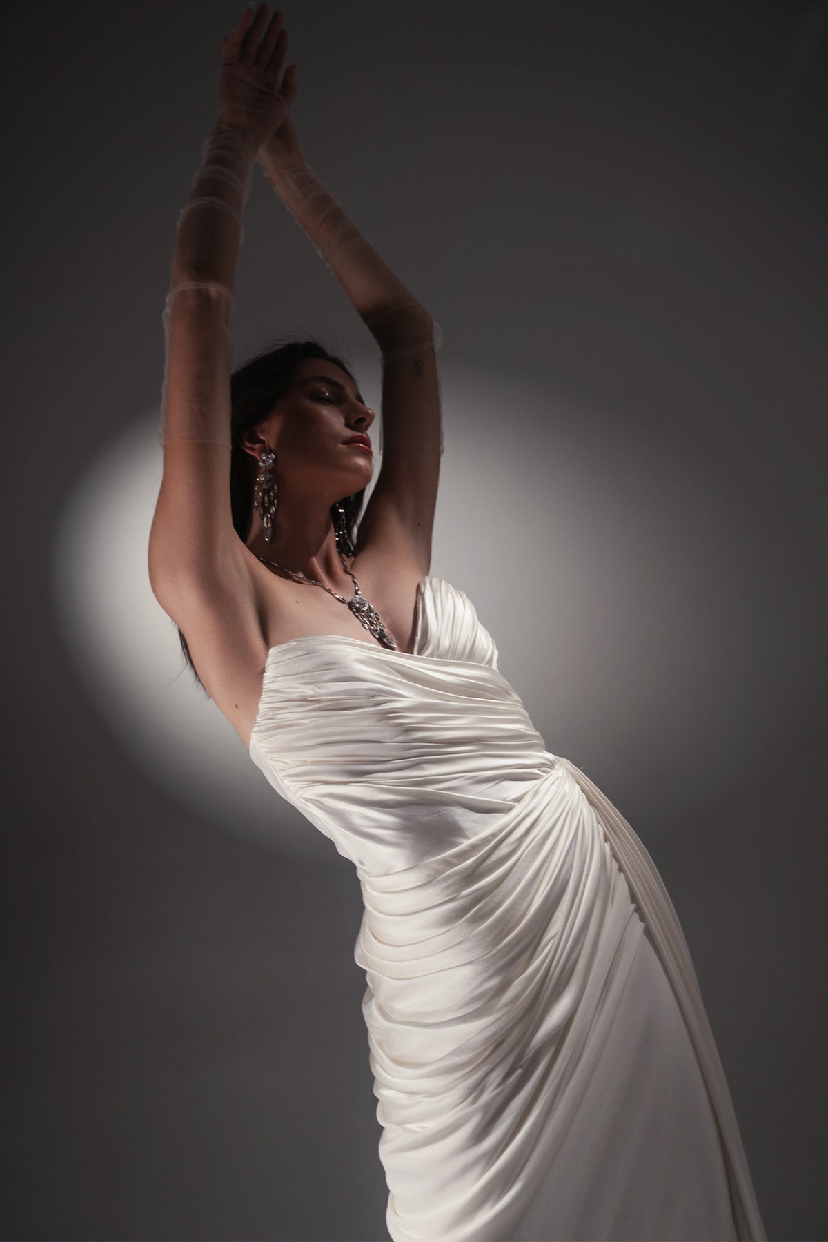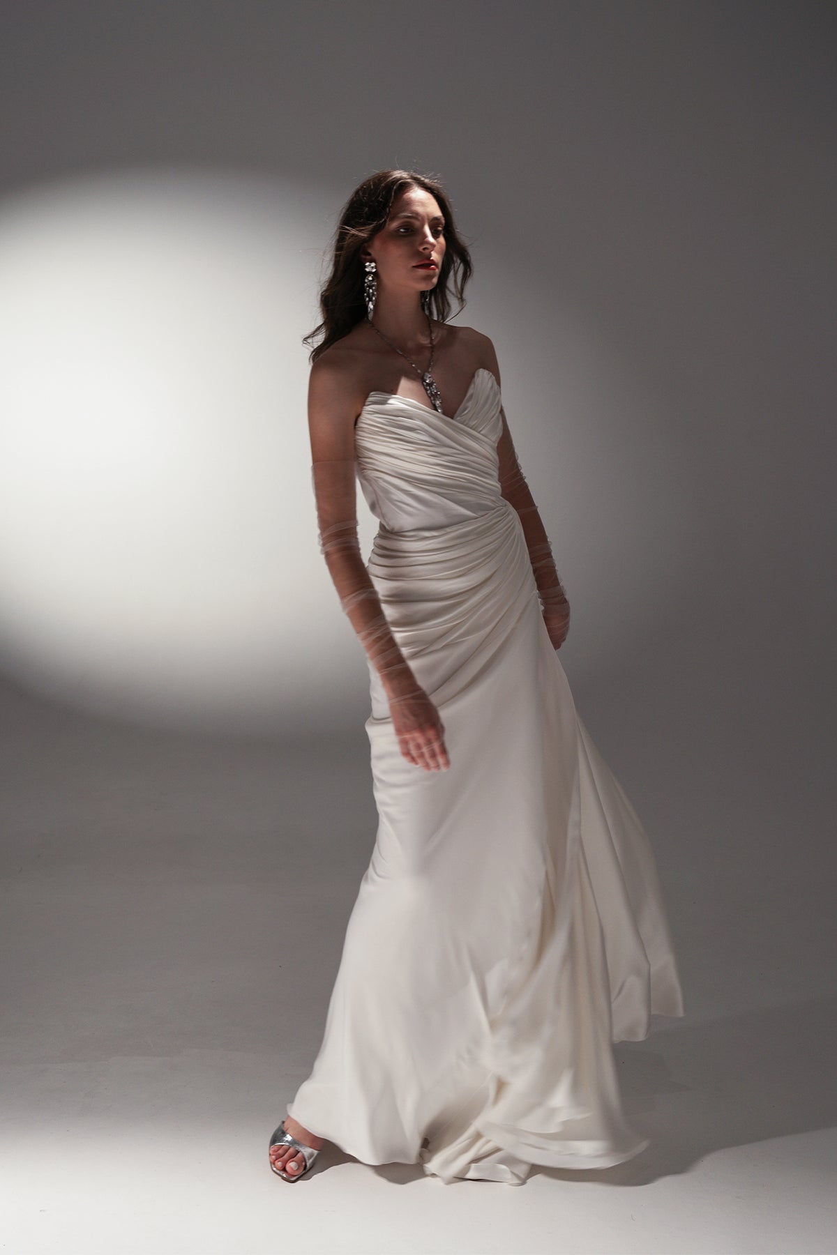 The Gaia gown features a softly structured bodice and delicate draping that enhances the natural shape of the body. Its fluid skirt creates an elongated, graceful silhouette with a timeless appeal. A refined bridal design that balances femininity and modern elegance.