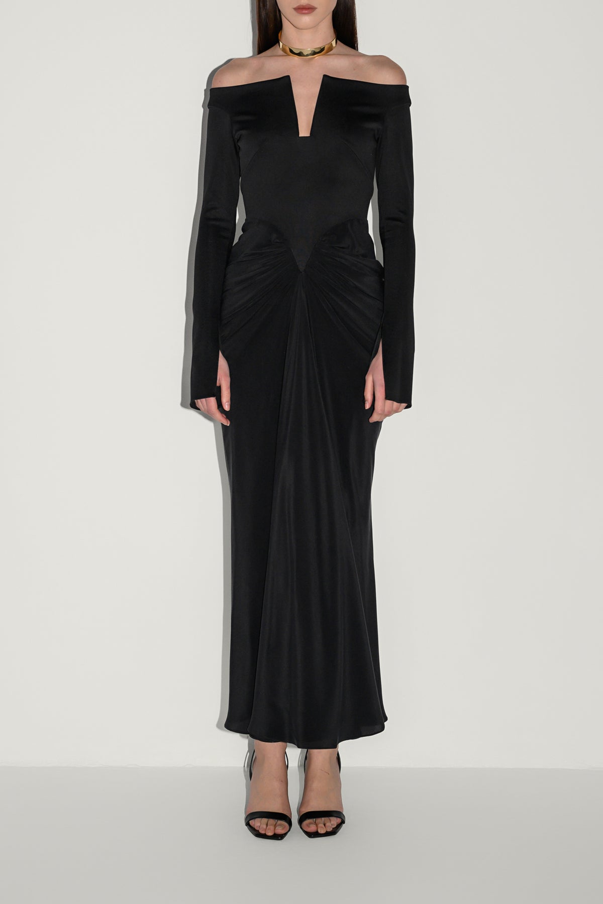 The Anita Ankle Length Dress by Rhea Costa features a dropped shoulder top with a refined rectangular neckline and a cascading skirt. This elegant design balances contemporary lines with timeless couture sophistication.