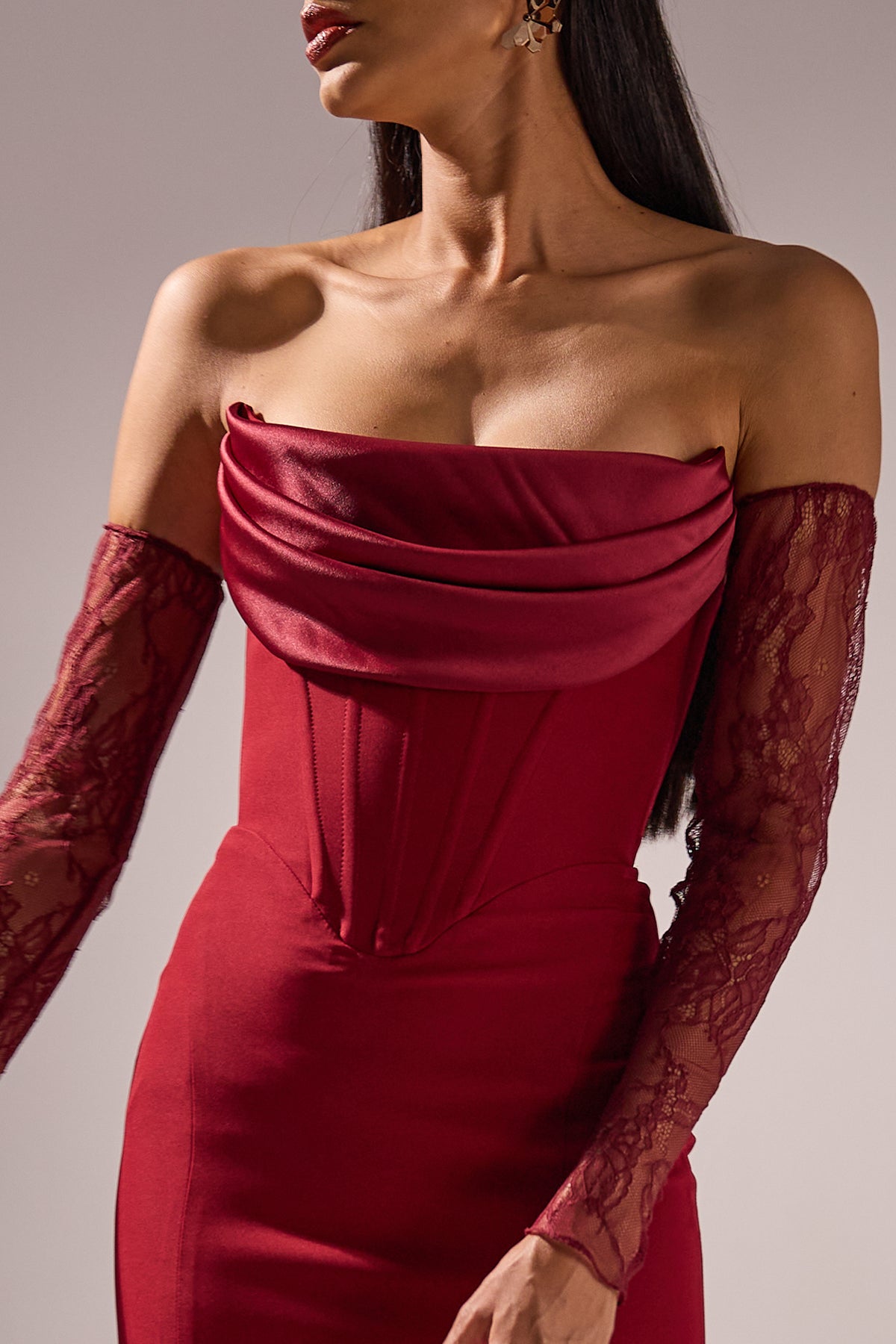 The Amada Long Dress combines timeless elegance with couture details. Featuring a fitted corset, panelled mermaid skirt, and detachable wide lace train, it is complemented by delicate lace sleeves for a refined finish. An exquisite creation by Rhea Costa that enhances sophistication and modern allure.