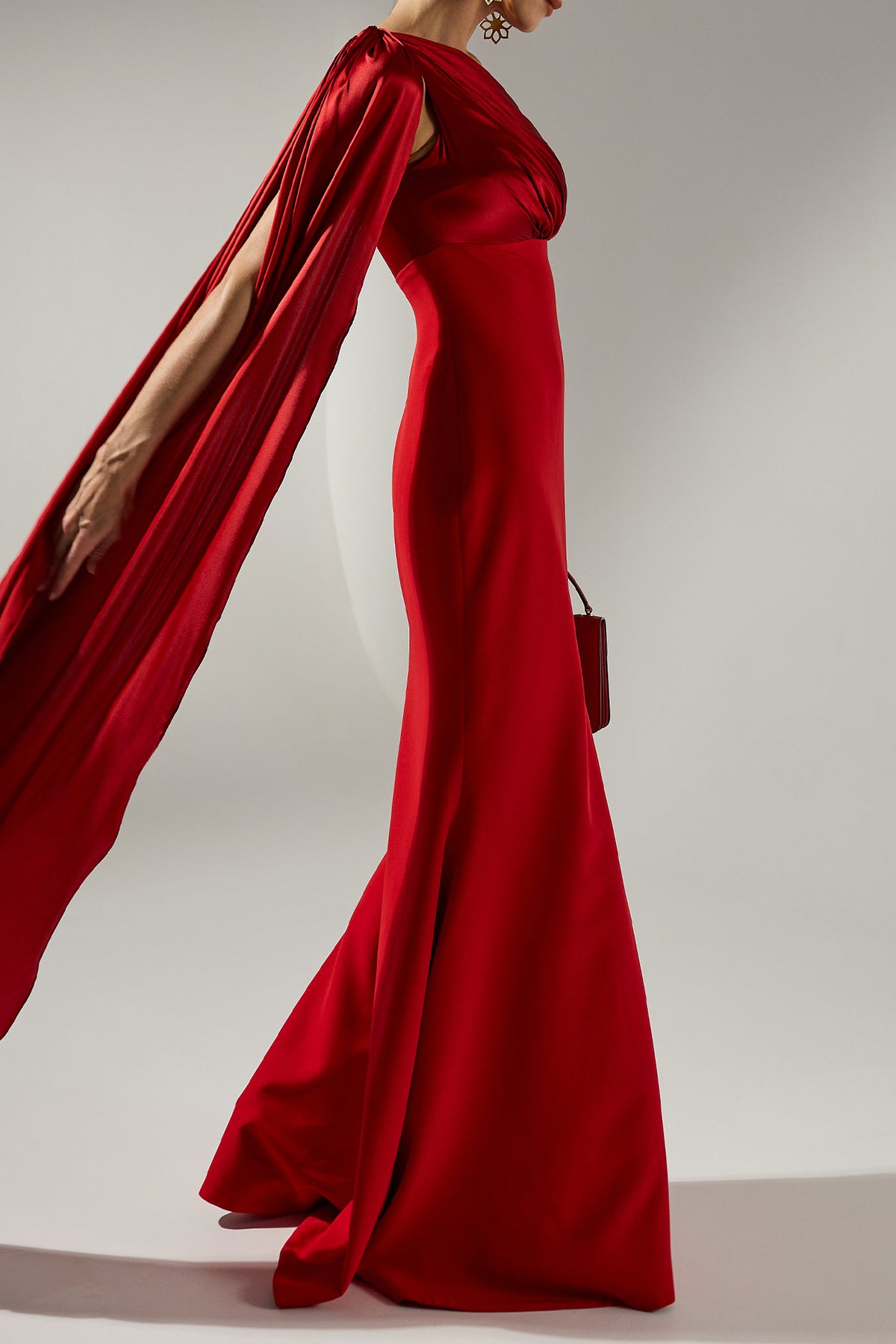 The Saira Silk Cape Long Dress pairs a sculpted one-shoulder draped bodice with a high-waisted mermaid skirt and a flowing detachable cape sleeve, capturing the dramatic, refined elegance of Rhea Costa.