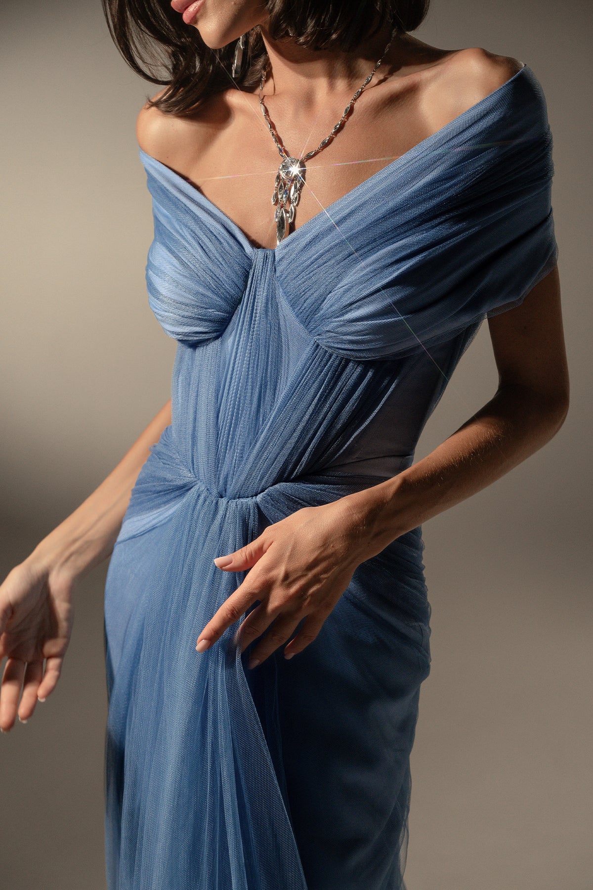 The Dalila Tulle Dress by Rhea Costa features a draped corset with off-the-shoulder ruching and a flowing tulle skirt with a back train, creating a refined, ethereal silhouette with elegant movement.