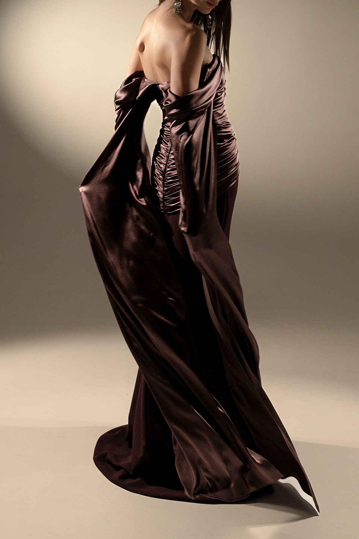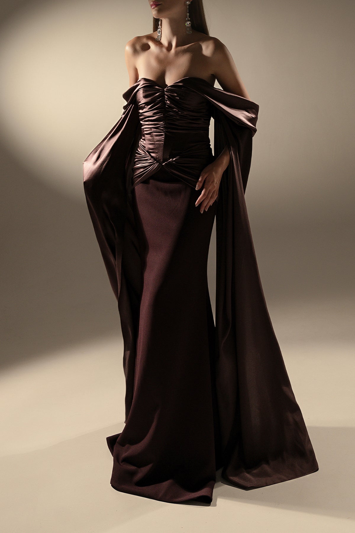 The Saliya Dress by Rhea Costa pairs a ruched corset with floor-length dropped-shoulder sleeves and a mermaid skirt, sculpting a dramatic, refined evening silhouette.
