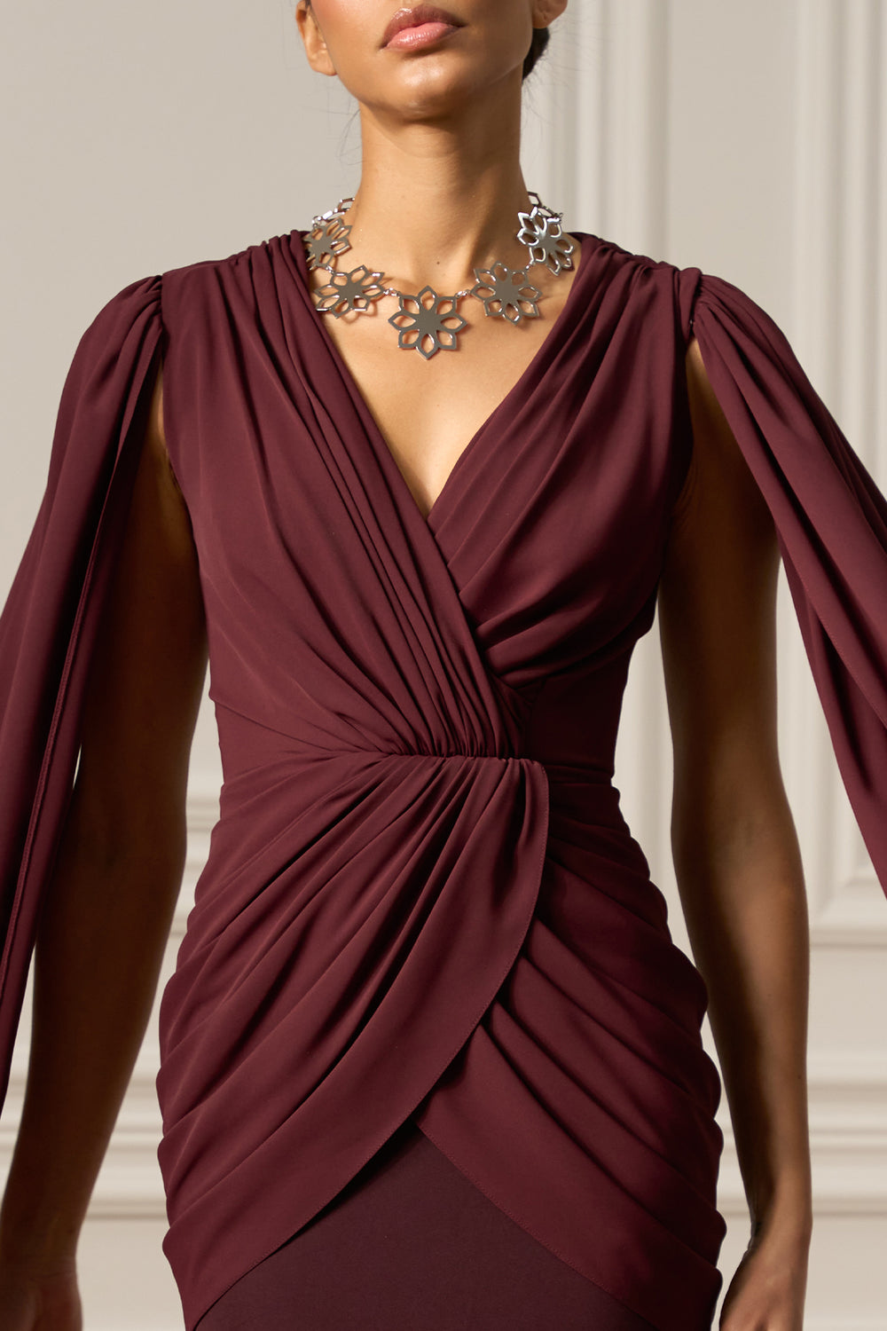 The *Evelyn Dress* features a softly draped V-neck bodice, fluid cascading sleeves, and a ruched skirt at the back that enhances the silhouette with graceful elegance.
