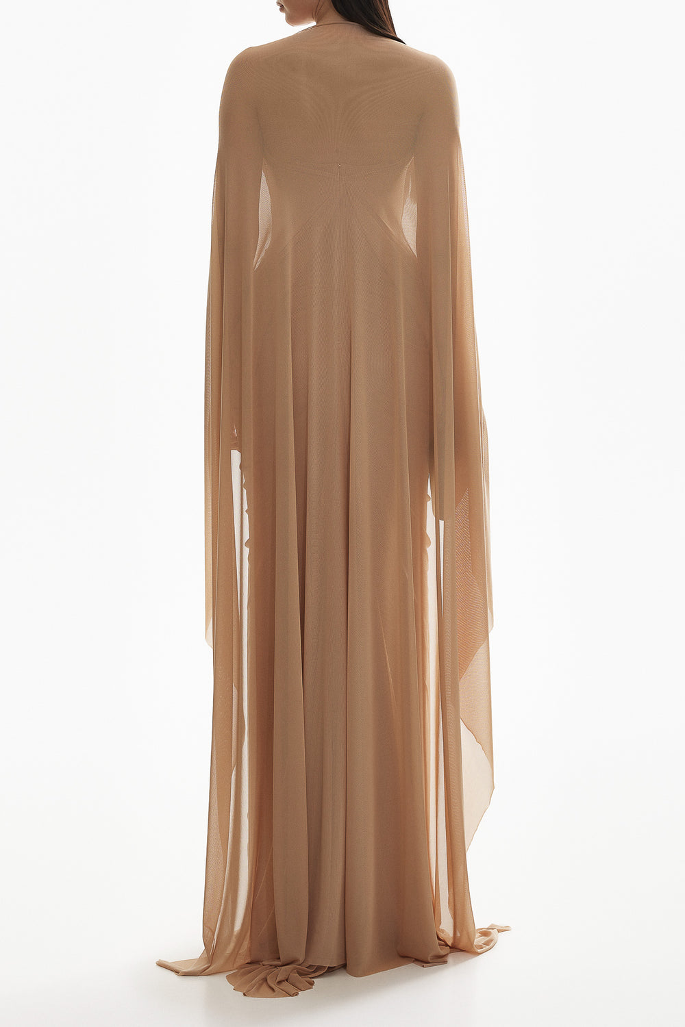 The Mera Mesh Tulle Cape Gown is a statement of refined elegance, combining a sculpted silhouette with ethereal details. The detachable mesh cape adds a touch of drama, while the mermaid shape and fitted corset enhance the figure, making it a perfect choice for grand occasions.