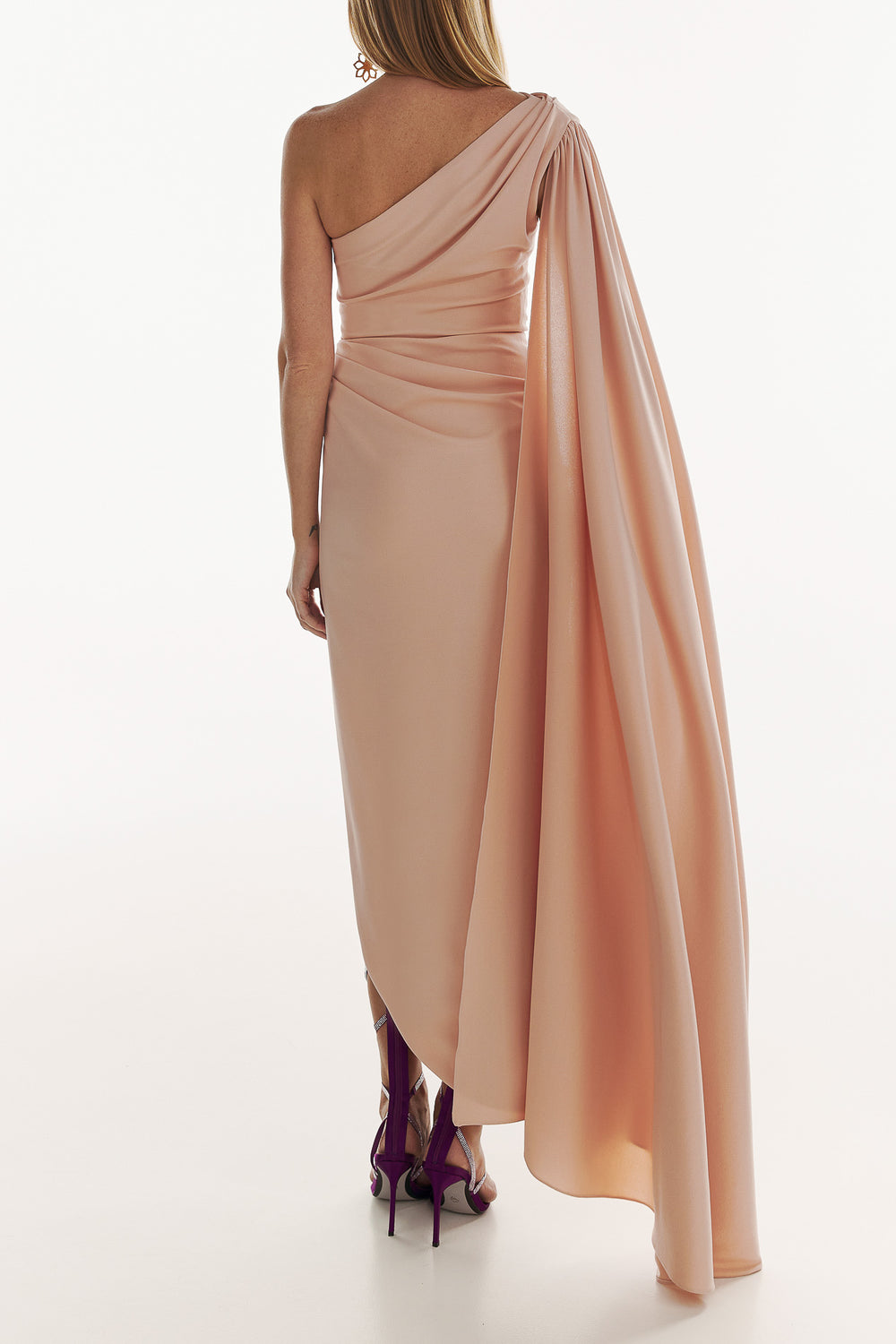 The *Kelly Dress* stands out with its clean one-shoulder silhouette, graceful cape, and fluid draping. Crafted in stretchy crepe, it offers structure and elegance in equal measure.
