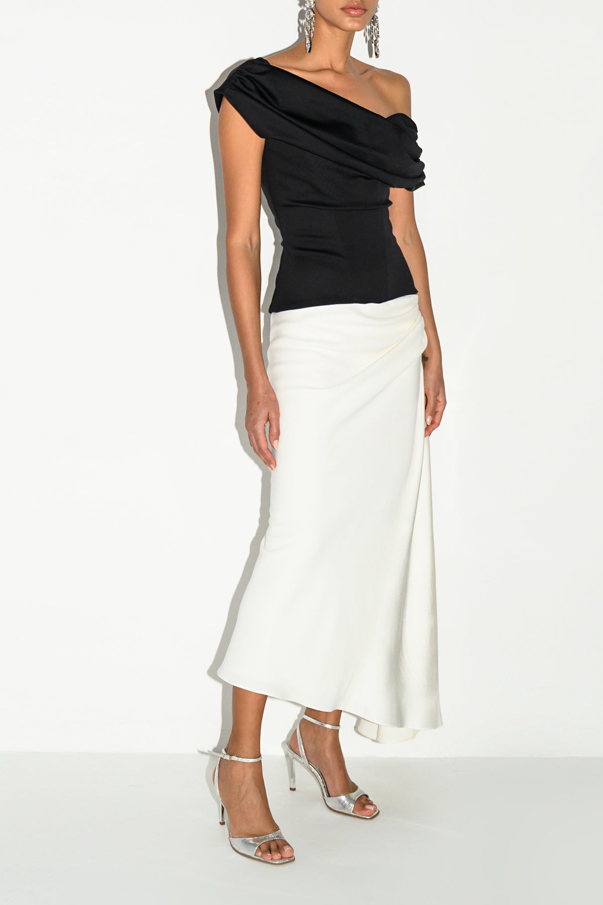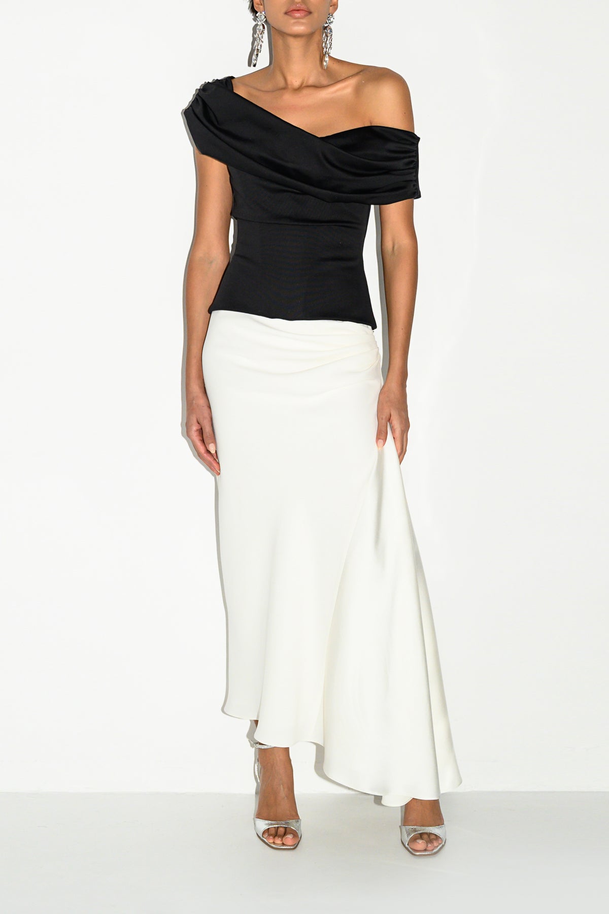 The Siri Top by Rhea Costa features a sculpted corset silhouette crafted in stretch fabric that adapts to the body. Finished with an open-end back zipper, it delivers clean structure and modern elegance.