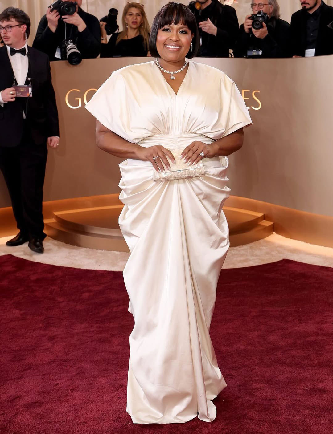 wearing Josie Celeste dress at the 2025 Golden Globes when she won the trophy for Best Actress in a Comedy Series