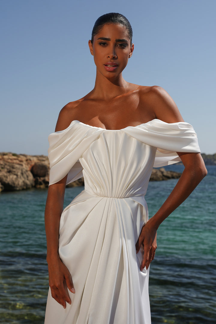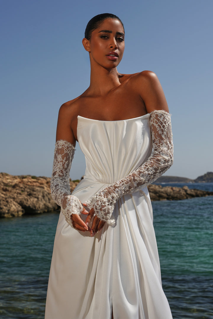 Unveil your elegance in the Helyna Bridal Satin Corset Dress. Featuring a daring front slit and delicate lace gloves, this stunning gown perfectly balances sophistication with a touch of bold beauty. Be the center of attention on your special day.